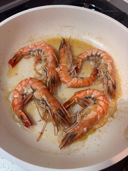 バターを入れてえびに絡める。塩、ブラックペッパーで味を整えたら完成。