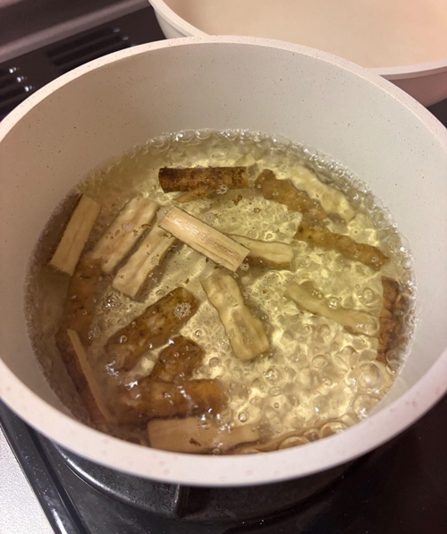 鍋に塩(分量外、スプーン1杯程度)を入れてごぼうを2分ほど茹でます。