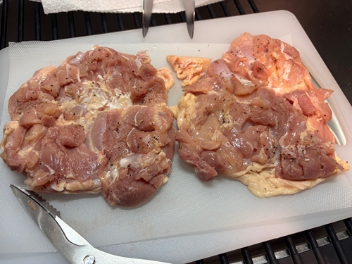 鶏肉の水気をキッチンペーパーでしっかり拭きとります。包丁で、余分な脂や筋を切っておきます。身が他より分厚いところは包丁で切り込みを入れます。