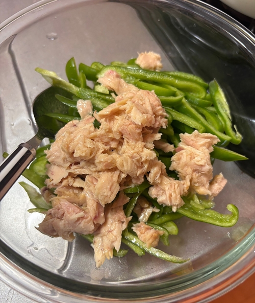 ピーマン、ツナ缶を耐熱ボウルに入れてラップをし、電子レンジ500wで2分加熱します。